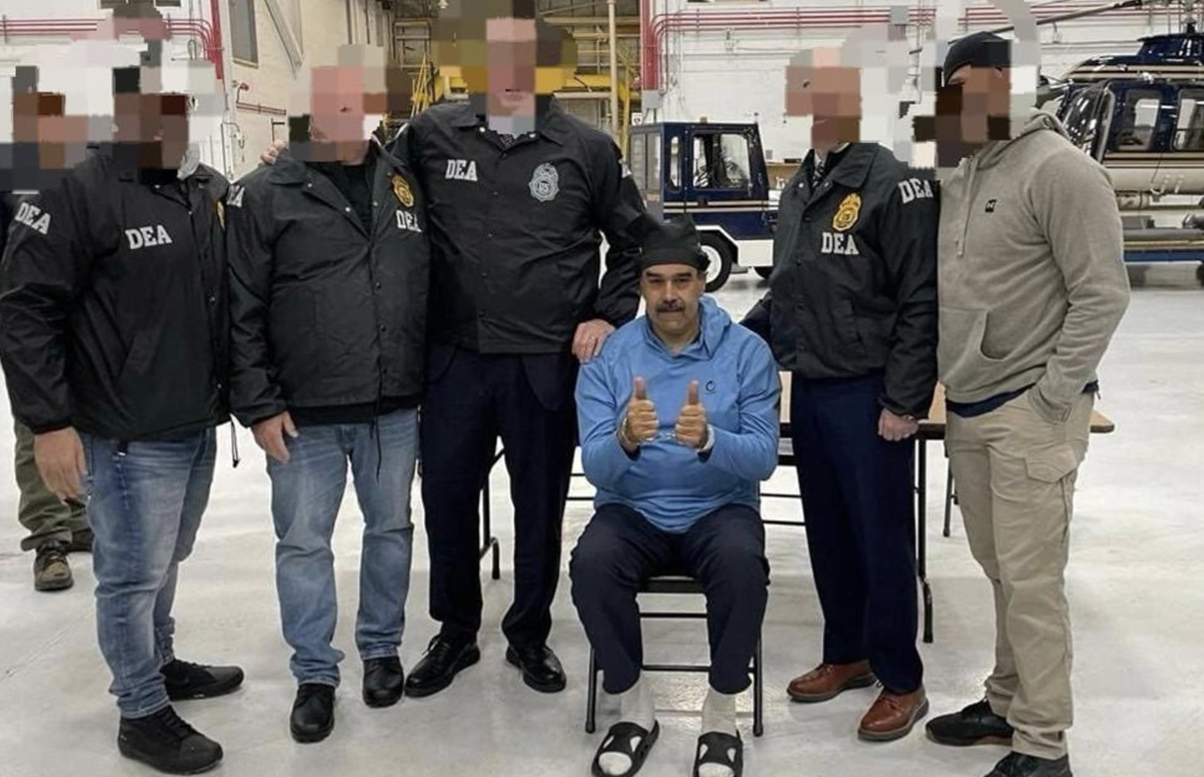 En las imágenes, Maduro aparece con una sudadera negra con capucha, caminando por un pasillo con alfombra azul que lleva la inscripción “DEA NYD”.