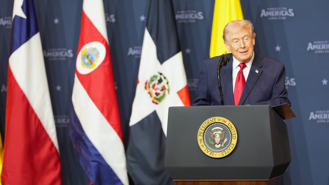 El presidente de Estados Unidos, Donald Trump, ha acusado a México de ser el epicentro de la violencia de los cárteles de la droga en la región para, sin solución de continuidad, alabar a su presidenta, Claudia Sheinbaum, diciendo que es “muy buena persona”. Ha asegurado, otra vez, que los criminales mandan en México y que hay que “erradicarlos” para garantizar la seguridad del pueblo estadounidense. En su discurso durante la inauguración de la cumbre Escudo de las Américas, que agrupa a líderes de la derecha en el continente, el republicano también ha anunciado la Coalición Contra los Cárteles en América, una nueva agrupación militar en América Latina.